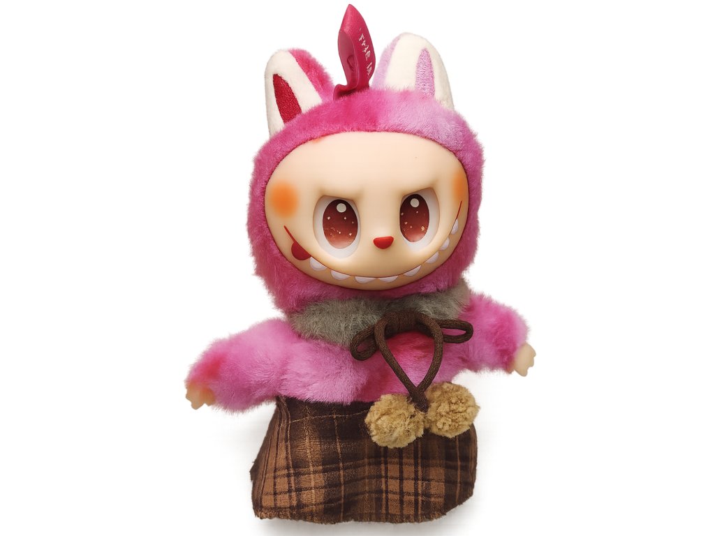 Zberateľská figúrka Pop Mart – výrazná postavička v ružovom huňatom oblečku s uškami, hnedou károvanou sukničkou a roztomilou mašličkou s brmbolcami. S veľkým úsmevom a...