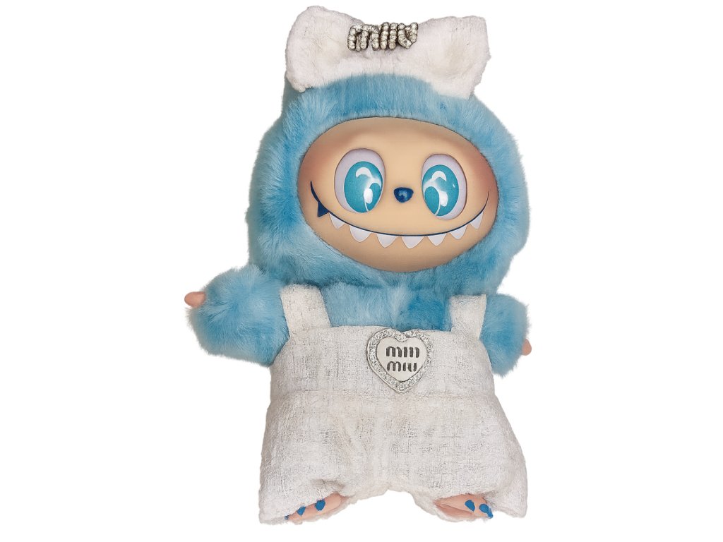 Exkluzívna zberateľská figúrka z dielne Pop Mart x The Monsters v štýlovej MIU MIU edícii očarí každého fanúšika dizajnových figúrok. Postavička má modrý huňatý overal, bielu mašľu s trblietavými detailmi a biele štruktúrované nohavice so srdiečkom a nápisom „MIU MIU“. Jej veľké, trblietavé oči a široký úsmev jej dodávajú jedinečný charakter a šmrnc luxusnej módy.