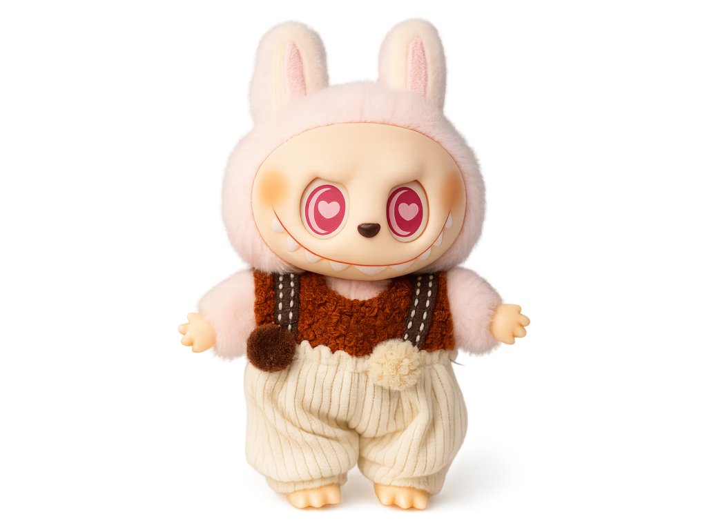 Zberateľská figúrka Pop Mart – rozkošná postavička s ružovými uškami, očami plnými srdiečok a huňatým outfitom v jemných tónoch. Krémové nohavice, hnedé traky a chlpaté brmbolce...